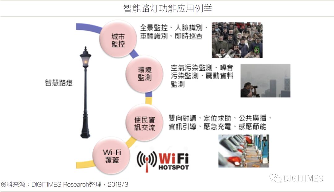 据统计,2017年全球使用中的路灯约3.17亿盏,随着城市路灯加入传感器,得以提供城市监控、环境监测、便民服务与Wi-Fi覆盖等多项功能。
